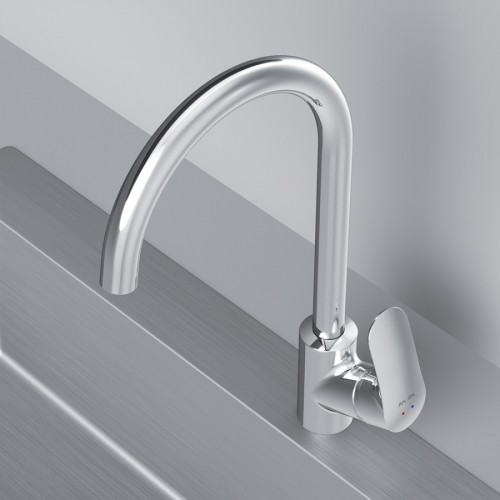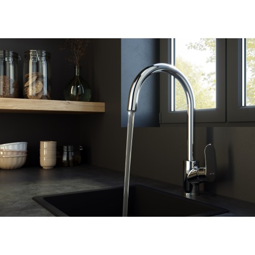 Смеситель изготовлен из латуни и покрыт хромированным слоем, что придает ему элегантный и современный вид. Управление осуществляется однорычажным механизмом, что позволяет легко регулировать температуру и напор воды. Встроенный аэратор обеспечивает экономичное расходование воды и мягкий поток. Поворотный излив позволяет удобно мойку посуды и овощей.