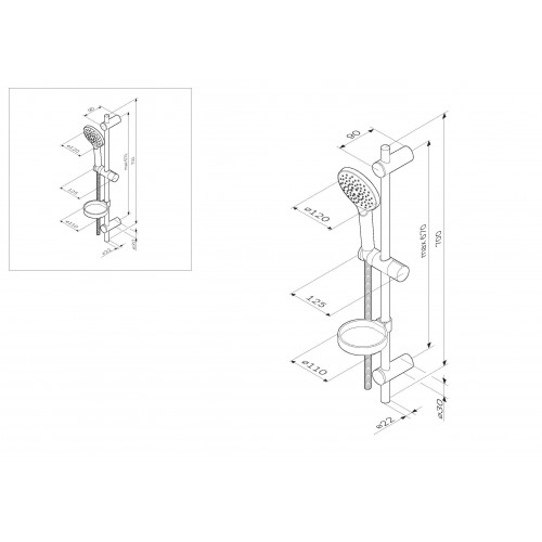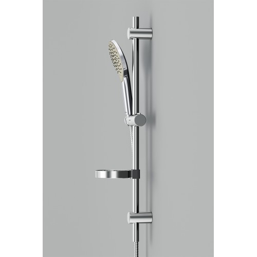 Изготовленный из латуни и пластика с хромированной отделкой, этот душевой комплект обладает прочностью и долговечностью. Ширина изделия составляет 125 мм, глубина - 130,5 мм, а высота - 700 мм. Держатель ручного душа регулируется в трех плоскостях, обеспечивая максимальный комфорт во время принятия душа.