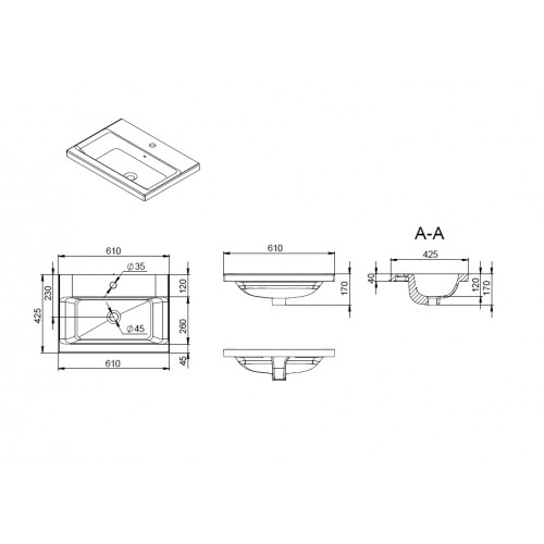 Эта раковина имеет компактные размеры: ширина 610 мм, глубина 425 мм и высота 170 мм. Она накладная и имеет одну чашу. Отверстие для смесителя предусмотрено.