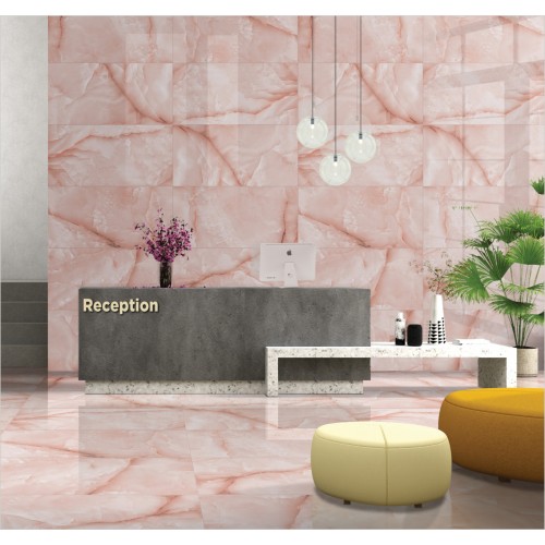 Цвет плитки – розовый, что придает интерьеру нежность и изысканность. Текстура плитки имитирует камень, добавляя еще больше реалистичности и стиля. Ширина плитки составляет 60 см, а длина – 120 см.