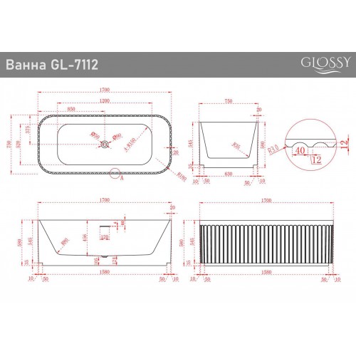 Акриловая ванна Glossy GL-7112 прямоугольная 170х75
