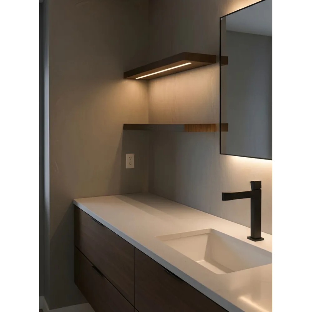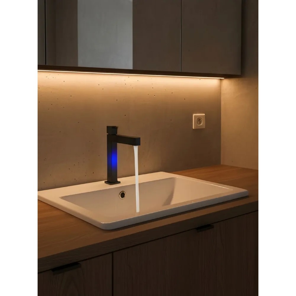 Компактный и стильный дизайн. Узкая, изящная форма смесителя экономит пространство и подчёркивает современный стиль ванной комнаты.